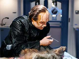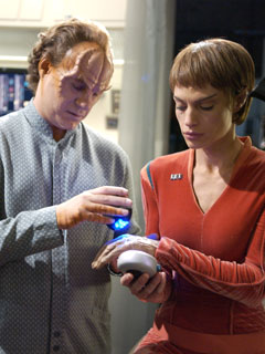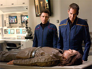 Sur l'Enterprise, Phlox étudie l'état de santé de Daniels mais ce dernier est à l'agonie car il a subi de fortes distorsions temporelles :