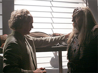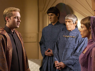 | Seuls, il lui annonce qu'il veut que la cérémonie traditionnelle se tienne au plus tôt malgré le manque d’enthousiasme de la Vulcaine. T’Pol tente de trouver toutes sortes d’excuses pour refuser, allant jusqu’à évoquer le duel à mort du Koh-la-fee (cf. Amok Time). Mais Koss est prêt à aller jusqu’au bout pour respecter la volonté de ses parents et les traditions familiales. Il ajoute qu’elle n’aura à rester avec lui qu’un an et qu’en échange de ce mariage, il promet que son père, un ministre haut placé, pourra aider T'Les à retrouver son poste à l’Académie. |