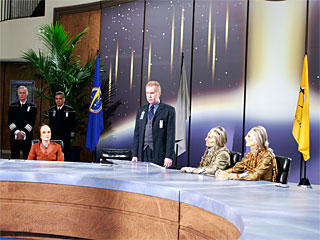 Après la visite, les deux capitaines se rendent au quartier général de Starfleet pour que Archer effectue un débriefing sur sa mission dans l’Etendue Delphique.