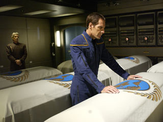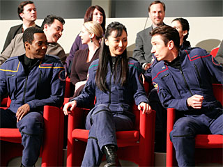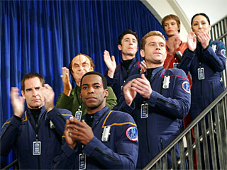 | Aujourd’hui, il veut étendre la mission de cette agence à la collaboration entre races et il se donne 6 mois pour y parvenir. Toute l’assistance applaudit, y compris les officiers principaux de l’Enterprise, mais Tucker ne semble pas enthousiaste, jugeant que l’homme est avant tout un politicien qui veut garder tout le crédit de ce moment historique, oubliant le rôle primordial qu’a joué l’équipage de l’Enterprise. Lorsque les officiers viennent féliciter Samuels, ce dernier remercie Archer d’être venu et il félicite Sato pour le travail remarquable qu’elle a fourni dans l’élaboration du traducteur universel. |